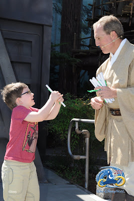 In planning a Disney vacation, I grappled with how many days we should spend at which parks. I really did not want to overdo it with Alec (the primary purpose of the trip being his enjoyment and, generally, he is happy to chill). The kicker that took us to Hollywood Studios was all the Star Wars action to be had. I understand they have a good Star Wars ride there (but it was under renovation when we were there). Mainly, though, I was excited by the idea that Alec could became a bonafide jedi padawan learner as part of a show put on multiple times each day at Hollywood Studios. It used to be that children were selected from the audience to participate, which (I understand) led to as much disappointment as joy. The current method of selecting participants is summarized as follow (based on our experience):